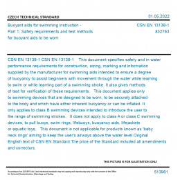 CSN EN 13138-1 This document specifies safety and in water performance requirements for construction, sizing, marking and information supplied by the manufacturer for swimming aids intended to ensure a degree of buoyancy to assist beginners with movement through the water while learning to swim or while learning part of a swimming stroke. It also gives methods of test for verification of these requirements. This document applies only to swimming devices that are designed to be worn, to be securely attached to the body and which have either inherent buoyancy or can be inflated. It only applies to class B swimming devices intended to introduce the user to the range of swimming strokes. It does not apply to class A or class C swimming devices, to pull buoys, swim rings, lifebuoys, buoyancy aids, lifejackets or aquatic toys. This document is not applicable for products known as 'baby neck rings' aiming to keep the user's airways above the water level. Original English text of CSN EN Standard. The price of the Standard included all amendments and correcturs.