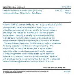 CSN EN 13166+A2 This European Standard specifies the requirements for factory made phenolic foam products, with or without facings or coatings, which are used for the thermal insulation of buildings. The products are manufactured in the form of boards and laminates. Products covered by this standard are also used in prefabricated thermal insulation systems and composite panels; the performance of systems incorporating these products is not covered. This standard describes product characteristics and includes procedures for testing, evaluation of conformity, marking and labelling. This standard does not specify the required level of a given property to be achieved by a product to demonstrate fitness for purpose in a particular application. The levels required for a given application are to be found in regulations or non-conflicting standards. Products with a declared thermal resistance lower than 0,40 m2.K/W or a declared thermal conductivity greater than 0,050 W/(m.K) at 10 °C are not covered by this standard. This standard does not cover in-situ thermal insulation products, products intended to be used for the thermal insulation of building equipment and industrial installations (covered by EN 14314 [3]). Original English text of CSN EN Standard. The price of the Standard included all amendments and correcturs.