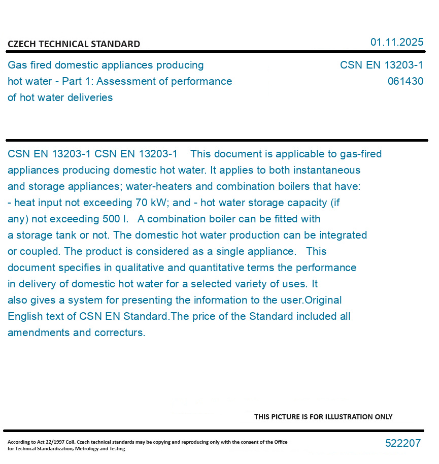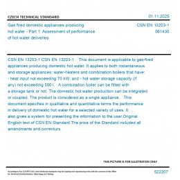 CSN EN 13203-1 This document is applicable to gas-fired appliances producing domestic hot water. It applies to both instantaneous and storage appliances; water-heaters and combination boilers that have: - heat input not exceeding 70 kW; and - hot water storage capacity (if any) not exceeding 500 l. A combination boiler can be fitted with a storage tank or not. The domestic hot water production can be integrated or coupled. The product is considered as a single appliance. This document specifies in qualitative and quantitative terms the performance in delivery of domestic hot water for a selected variety of uses. It also gives a system for presenting the information to the user. Original English text of CSN EN Standard. The price of the Standard included all amendments and correcturs.