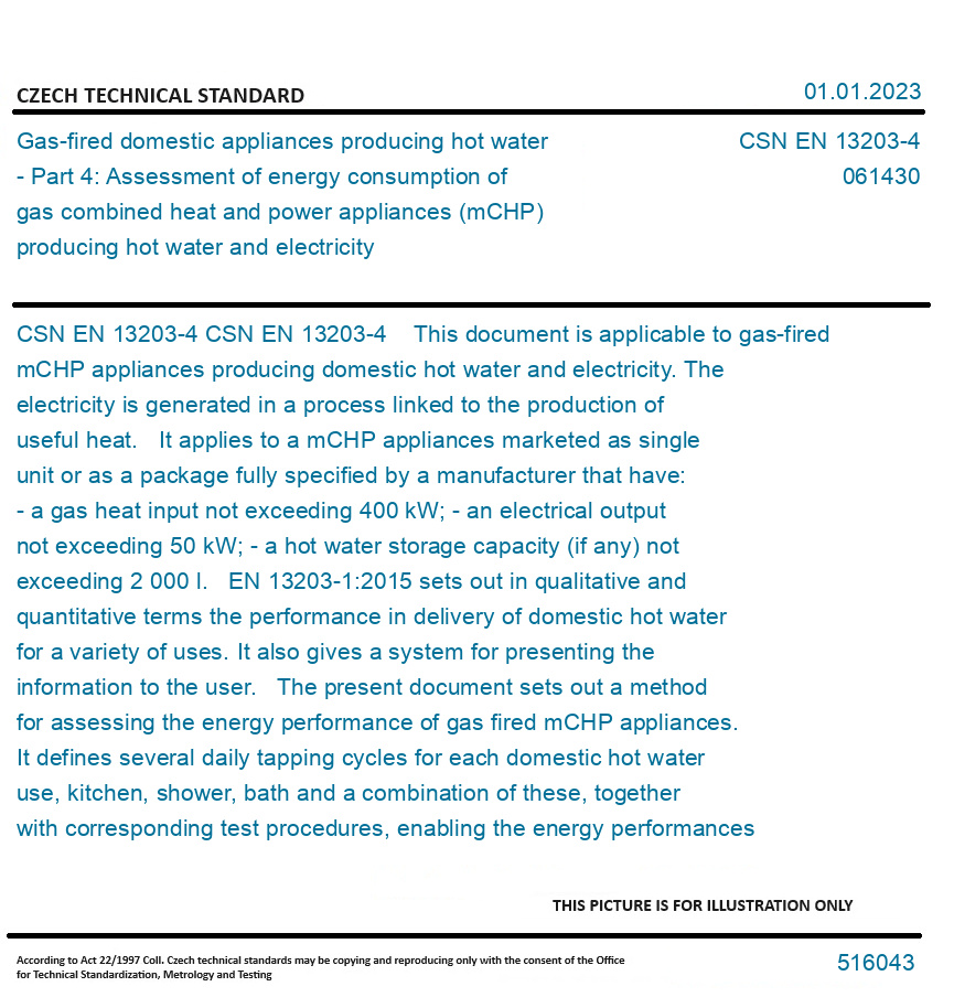 CSN EN 13203-4 This document is applicable to gas-fired mCHP appliances producing domestic hot water and electricity. The electricity is generated in a process linked to the production of useful heat. It applies to a mCHP appliances marketed as single unit or as a package fully specified by a manufacturer that have: - a gas heat input not exceeding 400 kW; - an electrical output not exceeding 50 kW; - a hot water storage capacity (if any) not exceeding 2 000 l. EN 13203-1:2015 sets out in qualitative and quantitative terms the performance in delivery of domestic hot water for a variety of uses. It also gives a system for presenting the information to the user. The present document sets out a method for assessing the energy performance of gas fired mCHP appliances. It defines several daily tapping cycles for each domestic hot water use, kitchen, shower, bath and a combination of these, together with corresponding test procedures, enabling the energy performances of different gas-fired appliances to be compared and matched to the needs of the user. When the mCHP generator does not supply domestic hot water in the summer period, the present standard is not applicable. EN 13203-2:2022 is used for performance assessment of these generators. Original English text of CSN EN Standard. The price of the Standard included all amendments and correcturs.