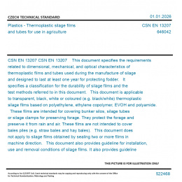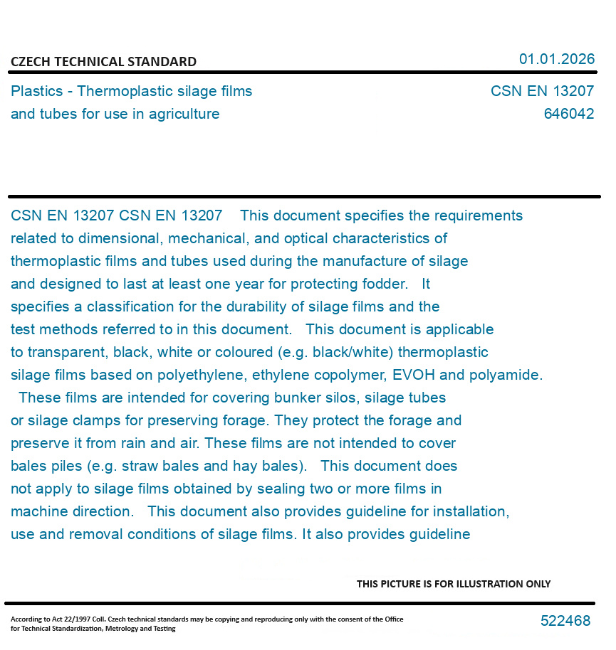 CSN EN 13207 This document specifies the requirements related to dimensional, mechanical, and optical characteristics of thermoplastic films and tubes used during the manufacture of silage and designed to last at least one year for protecting fodder. It specifies a classification for the durability of silage films and the test methods referred to in this document. This document is applicable to transparent, black, white or coloured (e.g. black/white) thermoplastic silage films based on polyethylene, ethylene copolymer, EVOH and polyamide. These films are intended for covering bunker silos, silage tubes or silage clamps for preserving forage. They protect the forage and preserve it from rain and air. These films are not intended to cover bales piles (e.g. straw bales and hay bales). This document does not apply to silage films obtained by sealing two or more films in machine direction. This document also provides guideline for installation, use and removal conditions of silage films. It also provides guideline for the conventional useful lifetime, as well as rules that allow evaluating the remaining use potential in the event of a failure before the normal end-of-use date.