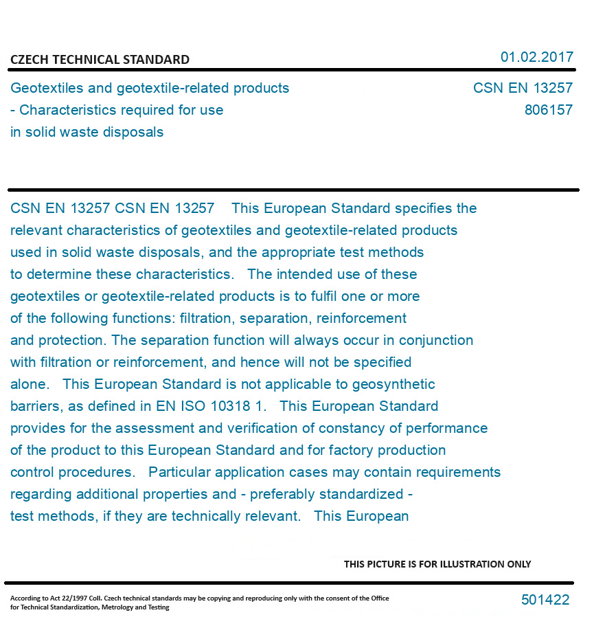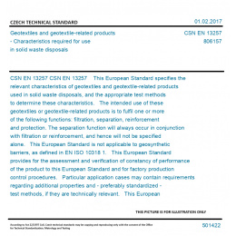 CSN EN 13257 This European Standard specifies the relevant characteristics of geotextiles and geotextile-related products used in solid waste disposals, and the appropriate test methods to determine these characteristics. The intended use of these geotextiles or geotextile-related products is to fulfil one or more of the following functions: filtration, separation, reinforcement and protection. The separation function will always occur in conjunction with filtration or reinforcement, and hence will not be specified alone. This European Standard is not applicable to geosynthetic barriers, as defined in EN ISO 10318 1. This European Standard provides for the assessment and verification of constancy of performance of the product to this European Standard and for factory production control procedures. Particular application cases may contain requirements regarding additional properties and - preferably standardized - test methods, if they are technically relevant. This European Standard may be used to derive design values by taking into account factors within the context of the definitions given in EN 1997 1 (Eurocode 7), e.g. factors of safety. The design life of the product should be determined, since its function may be temporary, as a construction expediency, or permanent, for the lifetime of the structure. Original English text of CSN EN Standard. The price of the Standard included all amendments and correcturs.