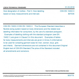 CSN EN 13402-3 This European Standard describes a flexible sizing system based on body dimensions and the related size labelling information for consumers, by the use of a standard pictogram. Examples of labelling clothing with the standard pictogram (see EN 13402 1) are given in Clause 5 in this document. Examples of tables for body measurements and intervals are given in Annex A (informative) to be used for compiling garment sizes for men, women, boys, girls and infants. Garment dimensions are not contained in this document. Original English text of CSN EN Standard. The price of the Standard included all amendments and correcturs.