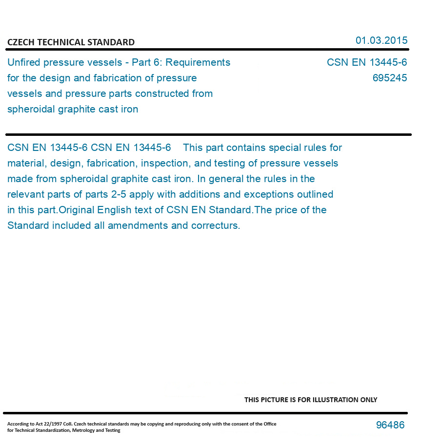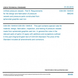 CSN EN 13445-6 This part contains special rules for material, design, fabrication, inspection, and testing of pressure vessels made from spheroidal graphite cast iron. In general the rules in the relevant parts of parts 2-5 apply with additions and exceptions outlined in this part. Original English text of CSN EN Standard. The price of the Standard included all amendments and correcturs.