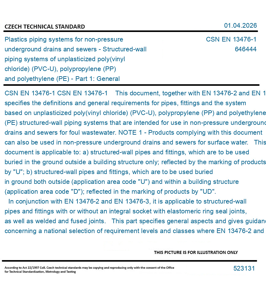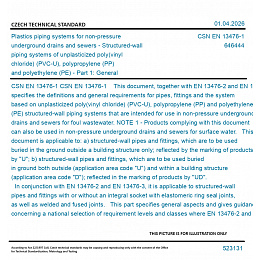 CSN EN 13476-1 This document, together with EN 13476-2 and EN 13476-3, specifies the definitions and general requirements for pipes, fittings and the system based on unplasticized poly(vinyl chloride) (PVC-U), polypropylene (PP) and polyethylene (PE) structured-wall piping systems that are intended for use in non-pressure underground drains and sewers for foul wastewater. NOTE 1 - Products complying with this document can also be used in non-pressure underground drains and sewers for surface water. This document is applicable to: a) structured-wall pipes and fittings, which are to be used buried in the ground outside a building structure only; reflected by the marking of products by "U"; b) structured-wall pipes and fittings, which are to be used buried in ground both outside (application area code "U") and within a building structure (application area code "D"); reflected in the marking of products by "UD". In conjunction with EN 13476-2 and EN 13476-3, it is applicable to structured-wall pipes and fittings with or without an integral socket with elastomeric ring seal joints, as well as welded and fused joints. This part specifies general aspects and gives guidance concerning a national selection of requirement levels and classes where EN 13476-2 and EN 13476-3 provide options. EN 13476-2 and EN 13476-3 specify material characteristics, dimensions and tolerances, test methods, test parameters and requirements for pipes with smooth internal and external surfaces, Type A, and pipes with smooth internal and profiled external surfaces, Type B, respectively. This document, together with EN 13476-2 and EN 13476-3, is applicable to a range of pipe and fitting sizes, materials, pipe constructions, stiffness classes and tolerance classes and offers recommendations concerning colours. NOTE 2 - It is the responsibility of the purchaser or specifier to make the appropriate selections from these aspects, taking into account their particular requirements and any relevant national regulations and installation practices or codes. NOTE 3 - Pipes, fittings and other components conforming to any plastic product standards referred to in Clause 2 can be used with pipes and fittings conforming to this document, when they conform to the requirements for joint dimensions given in EN 13476-2 and to the performance requirements given in Clause 9.