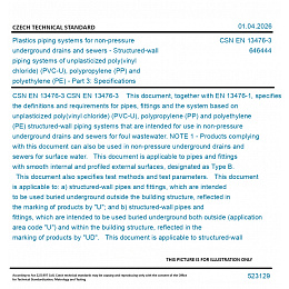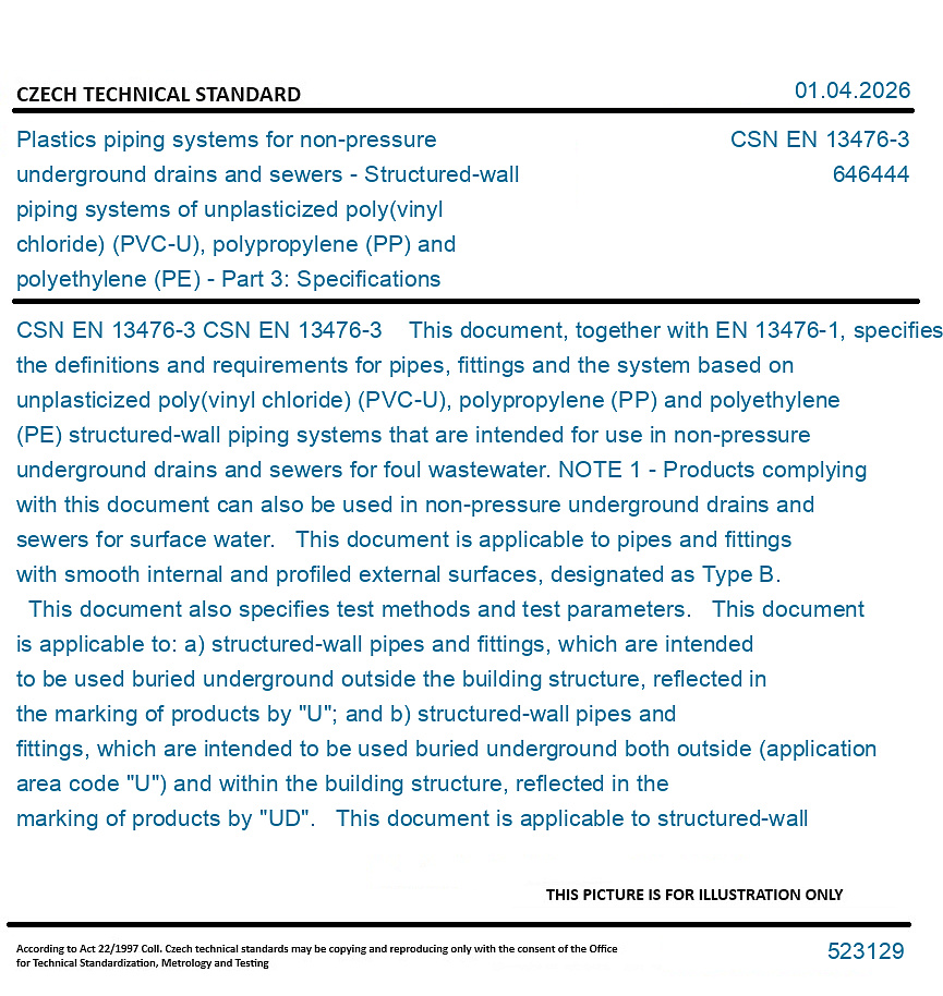 CSN EN 13476-3 This document, together with EN 13476-1, specifies the definitions and requirements for pipes, fittings and the system based on unplasticized poly(vinyl chloride) (PVC-U), polypropylene (PP) and polyethylene (PE) structured-wall piping systems that are intended for use in non-pressure underground drains and sewers for foul wastewater. NOTE 1 - Products complying with this document can also be used in non-pressure underground drains and sewers for surface water. This document is applicable to pipes and fittings with smooth internal and profiled external surfaces, designated as Type B. This document also specifies test methods and test parameters. This document is applicable to: a) structured-wall pipes and fittings, which are intended to be used buried underground outside the building structure, reflected in the marking of products by "U"; and b) structured-wall pipes and fittings, which are intended to be used buried underground both outside (application area code "U") and within the building structure, reflected in the marking of products by "UD". This document is applicable to structured-wall pipes and fittings with or without an integral socket with elastomeric ring seal joints as well as welded and fused joints. This document is applicable to a range of pipe and fitting sizes, materials, pipe constructions, stiffness classes, application areas, tolerance classes and gives recommendations concerning colours. NOTE 2 - It is the responsibility of the purchaser or specifier to make the appropriate selections from these aspects, taking into account their particular requirements and any relevant national regulations and installation practices or codes.