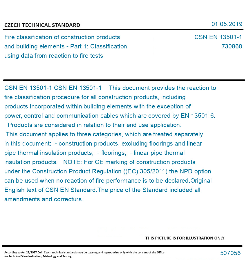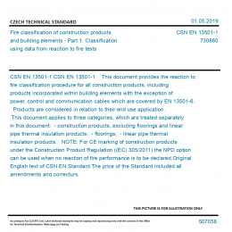 CSN EN 13501-1 This document provides the reaction to fire classification procedure for all construction products, including products incorporated within building elements with the exception of power, control and communication cables which are covered by EN 13501-6. Products are considered in relation to their end use application. This document applies to three categories, which are treated separately in this document: - construction products, excluding floorings and linear pipe thermal insulation products; - floorings; - linear pipe thermal insulation products. NOTE: For CE marking of construction products under the Construction Product Regulation ((EC) 305/2011) the NPD option can be used when no reaction of fire performance is to be declared. Original English text of CSN EN Standard. The price of the Standard included all amendments and correcturs.