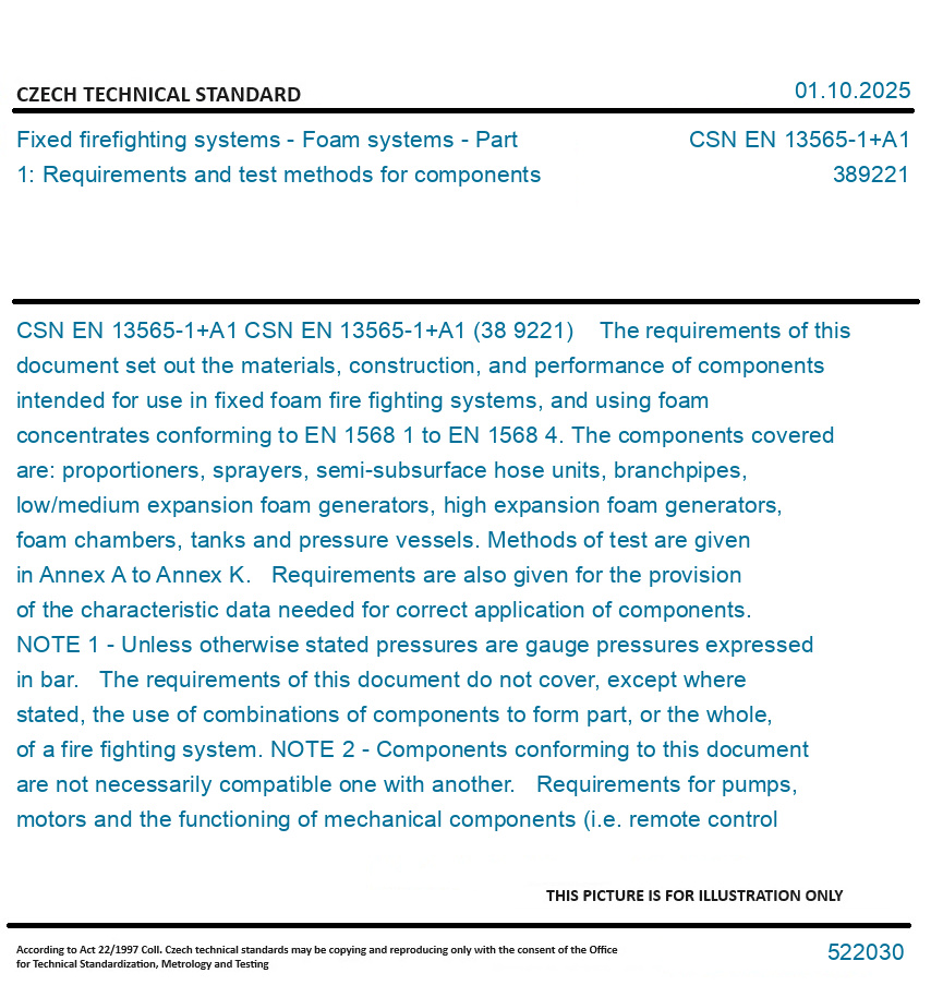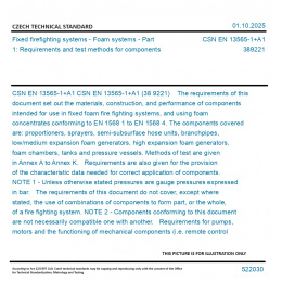 CSN EN 13565-1+A1 (38 9221) The requirements of this document set out the materials, construction, and performance of components intended for use in fixed foam fire fighting systems, and using foam concentrates conforming to EN 1568 1 to EN 1568 4. The components covered are: proportioners, sprayers, semi-subsurface hose units, branchpipes, low/medium expansion foam generators, high expansion foam generators, foam chambers, tanks and pressure vessels. Methods of test are given in Annex A to Annex K. Requirements are also given for the provision of the characteristic data needed for correct application of components. NOTE 1 - Unless otherwise stated pressures are gauge pressures expressed in bar. The requirements of this document do not cover, except where stated, the use of combinations of components to form part, or the whole, of a fire fighting system. NOTE 2 - Components conforming to this document are not necessarily compatible one with another. Requirements for pumps, motors and the functioning of mechanical components (i.e. remote control turrets) are outside the scope of this document. Original English text of CSN EN Standard. The price of the Standard included all amendments and correcturs.