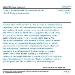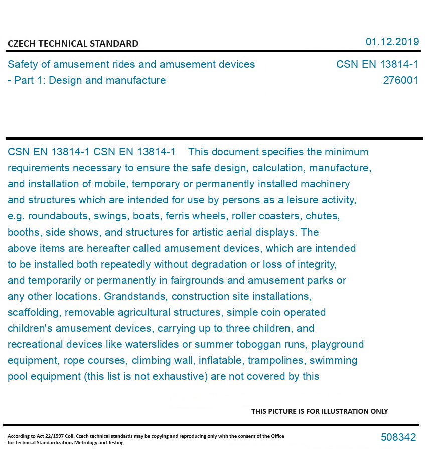 CSN EN 13814-1 This document specifies the minimum requirements necessary to ensure the safe design, calculation, manufacture, and installation of mobile, temporary or permanently installed machinery and structures which are intended for use by persons as a leisure activity, e.g. roundabouts, swings, boats, ferris wheels, roller coasters, chutes, booths, side shows, and structures for artistic aerial displays. The above items are hereafter called amusement devices, which are intended to be installed both repeatedly without degradation or loss of integrity, and temporarily or permanently in fairgrounds and amusement parks or any other locations. Grandstands, construction site installations, scaffolding, removable agricultural structures, simple coin operated children's amusement devices, carrying up to three children, and recreational devices like waterslides or summer toboggan runs, playground equipment, rope courses, climbing wall, inflatable, trampolines, swimming pool equipment (this list is not exhaustive) are not covered by this document. For all the equipment not covered by the requirements of EN 13814 1, the relevant standards apply. Nevertheless this document can be used in the design of any similar structural or passenger carrying amusement device not explicitly mentioned herein. In terms of workers' health and safety, national regulations apply. This document is applicable to manufacturing and major modification of amusement devices and rides for designs after the effective date of publication.