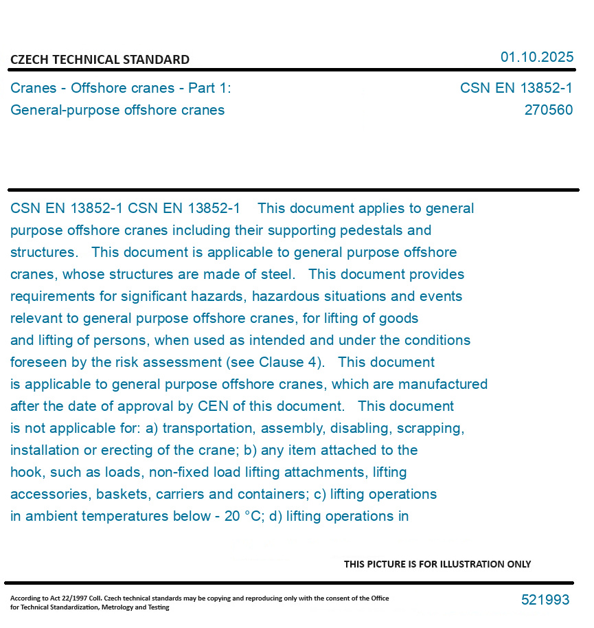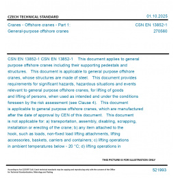 CSN EN 13852-1 This document applies to general purpose offshore cranes including their supporting pedestals and structures. This document is applicable to general purpose offshore cranes, whose structures are made of steel. This document provides requirements for significant hazards, hazardous situations and events relevant to general purpose offshore cranes, for lifting of goods and lifting of persons, when used as intended and under the conditions foreseen by the risk assessment (see Clause 4). This document is applicable to general purpose offshore cranes, which are manufactured after the date of approval by CEN of this document. This document is not applicable for: a) transportation, assembly, disabling, scrapping, installation or erecting of the crane; b) any item attached to the hook, such as loads, non-fixed load lifting attachments, lifting accessories, baskets, carriers and containers; c) lifting operations in ambient temperatures below - 20 °C; d) lifting operations in ambient temperatures above 45 °C; e) accidental loads as a result of collisions, earthquakes, explosions, etc., which are not covered by exceptional loads defined in Table B.7; f) floating cranes (covered by EN 13852 2), light offshore cranes (covered by EN 13852 3) and 2D/3D motion compensated cranes; g) subsea lifting operations; h) lifting operations involving more than one crane; i) offshore cranes as part of the emergency preparedness plan for evacuation. Original English text of CSN EN Standard. The price of the Standard included all amendments and correcturs.