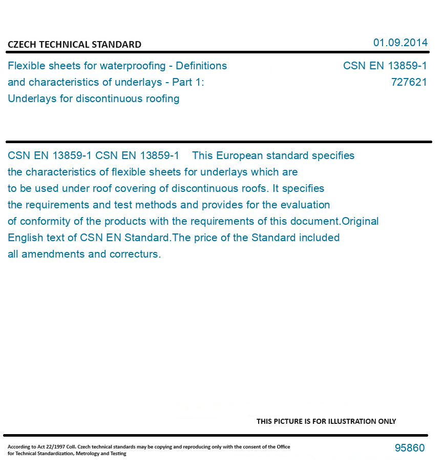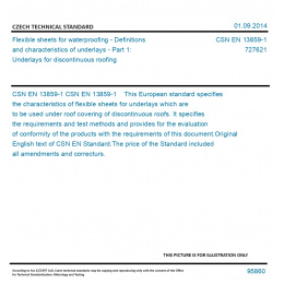 CSN EN 13859-1 This European standard specifies the characteristics of flexible sheets for underlays which are to be used under roof covering of discontinuous roofs. It specifies the requirements and test methods and provides for the evaluation of conformity of the products with the requirements of this document. Original English text of CSN EN Standard. The price of the Standard included all amendments and correcturs.