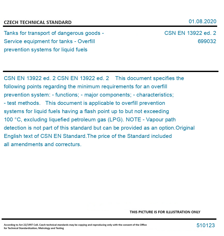 CSN EN 13922 ed. 2 This document specifies the following points regarding the minimum requirements for an overfill prevention system: - functions; - major components; - characteristics; - test methods. This document is applicable to overfill prevention systems for liquid fuels having a flash point up to but not exceeding 100 °C, excluding liquefied petroleum gas (LPG). NOTE - Vapour path detection is not part of this standard but can be provided as an option. Original English text of CSN EN Standard. The price of the Standard included all amendments and correcturs.