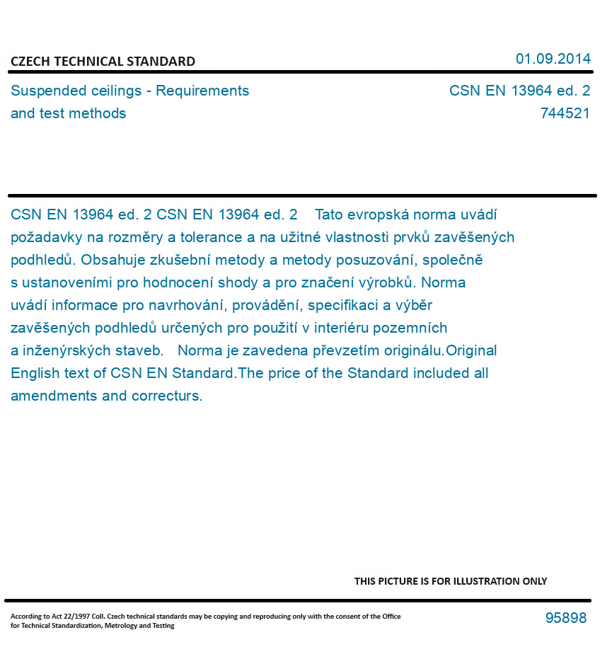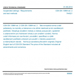 CSN EN 13964 ed. 2 Tato evropská norma uvádí požadavky na rozměry a tolerance a na užitné vlastnosti prvků zavěšených podhledů. Obsahuje zkušební metody a metody posuzování, společně s ustanoveními pro hodnocení shody a pro značení výrobků. Norma uvádí informace pro navrhování, provádění, specifikaci a výběr zavěšených podhledů určených pro použití v interiéru pozemních a inženýrských staveb. Norma je zavedena převzetím originálu. Original English text of CSN EN Standard. The price of the Standard included all amendments and correcturs.