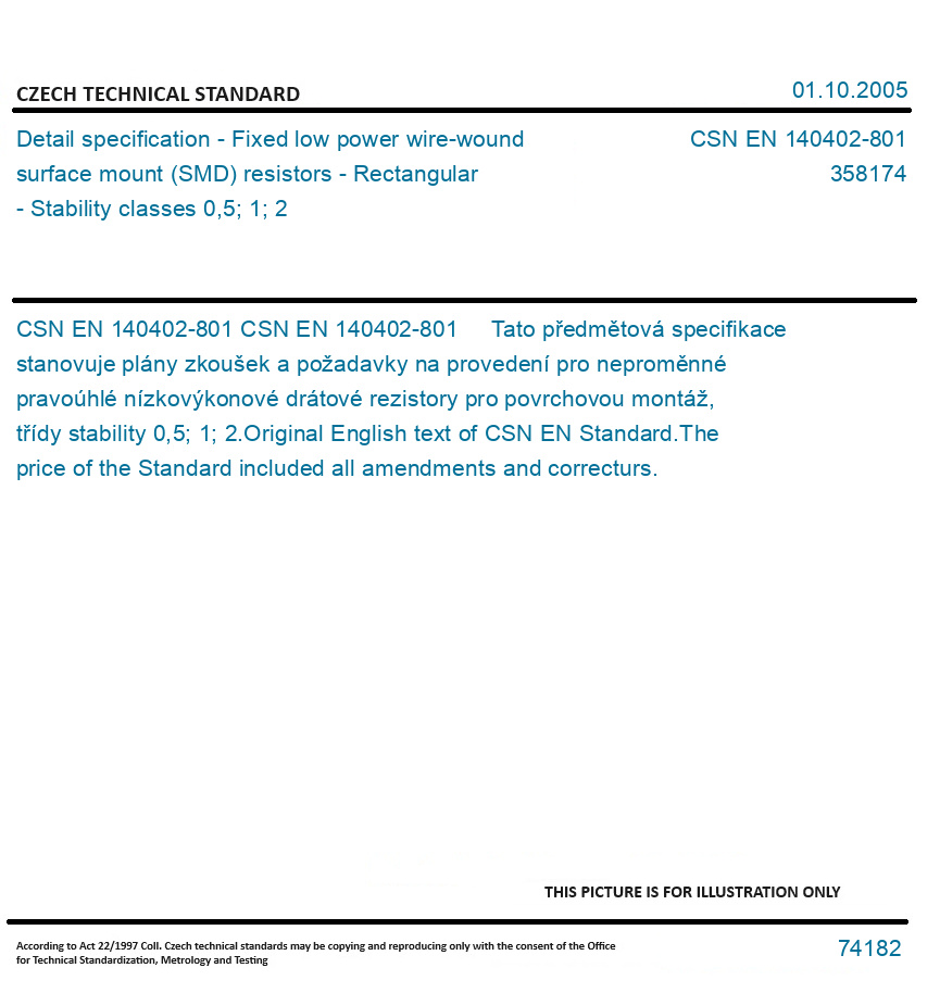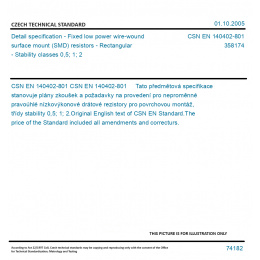 CSN EN 140402-801 Tato předmětová specifikace stanovuje plány zkoušek a požadavky na provedení pro neproměnné pravoúhlé nízkovýkonové drátové rezistory pro povrchovou montáž, třídy stability 0,5; 1; 2. Original English text of CSN EN Standard. The price of the Standard included all amendments and correcturs.