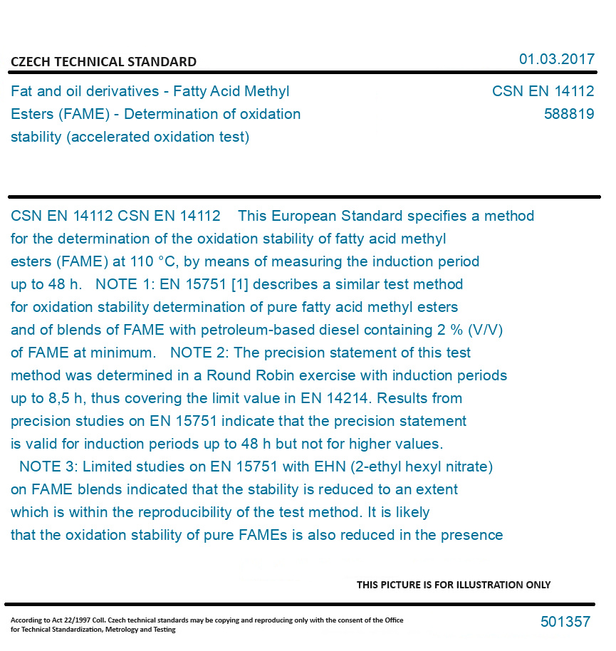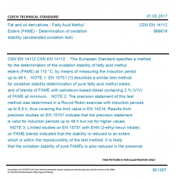 CSN EN 14112 This European Standard specifies a method for the determination of the oxidation stability of fatty acid methyl esters (FAME) at 110 °C, by means of measuring the induction period up to 48 h. NOTE 1: EN 15751 [1] describes a similar test method for oxidation stability determination of pure fatty acid methyl esters and of blends of FAME with petroleum-based diesel containing 2 % (V/V) of FAME at minimum. NOTE 2: The precision statement of this test method was determined in a Round Robin exercise with induction periods up to 8,5 h, thus covering the limit value in EN 14214. Results from precision studies on EN 15751 indicate that the precision statement is valid for induction periods up to 48 h but not for higher values. NOTE 3: Limited studies on EN 15751 with EHN (2-ethyl hexyl nitrate) on FAME blends indicated that the stability is reduced to an extent which is within the reproducibility of the test method. It is likely that the oxidation stability of pure FAMEs is also reduced in the presence of EHN when EN 14112 is used for testing. Original English text of CSN EN Standard. The price of the Standard included all amendments and correcturs.