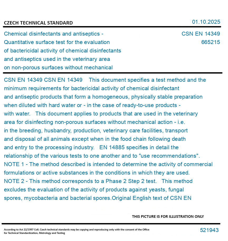 >CSN Standards>66 CHEMICAL INDUSTRY PRODUCTS>6652 Chemical disinfectants>CSN EN 14349 - Chemical disinfectants and antiseptics - Quantitative surface test for the evaluation of bactericidal activity of chemical disinfectants and antiseptics used in the veterinary area on non-porous surfaces without mechanical action - Test method and requirements (phase 2, step 2)