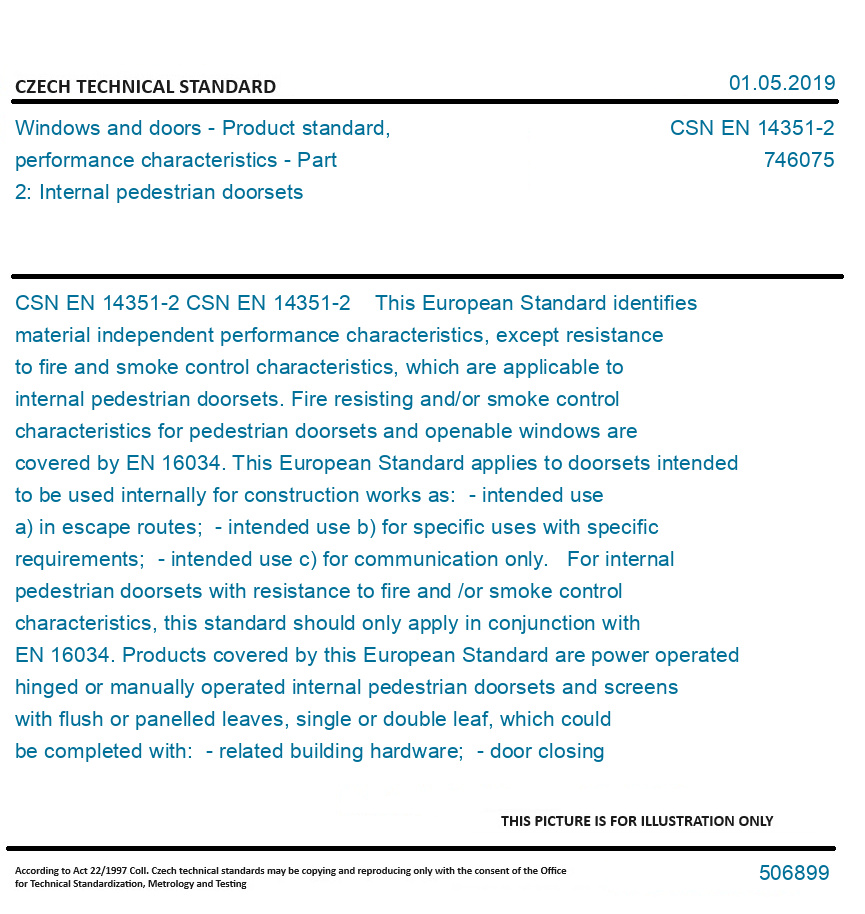 CSN EN 14351-2 This European Standard identifies material independent performance characteristics, except resistance to fire and smoke control characteristics, which are applicable to internal pedestrian doorsets. Fire resisting and/or smoke control characteristics for pedestrian doorsets and openable windows are covered by EN 16034. This European Standard applies to doorsets intended to be used internally for construction works as: - intended use a) in escape routes; - intended use b) for specific uses with specific requirements; - intended use c) for communication only. For internal pedestrian doorsets with resistance to fire and /or smoke control characteristics, this standard should only apply in conjunction with EN 16034. Products covered by this European Standard are power operated hinged or manually operated internal pedestrian doorsets and screens with flush or panelled leaves, single or double leaf, which could be completed with: - related building hardware; - door closing devices; - integral fanlights; - adjacent parts that are contained within a single frame for inclusion in a single aperture. Products covered by this European Standard are not assessed for structural applications. This European Standard does not apply to: - industrial, commercial and garage doors and gates according to EN 13241; - external pedestrian doorsets according to EN 14351-1; - door leaves placed on the market as a single unit; - door frames placed on the market as a single unit; - power operated pedestrian doorsets, other than swing type, according to EN 16361. Doorsets can be placed on the market with their component (leaf and frame) separate when each of these components are clearly identified. This European Standard does not deal with any specific requirements on noise emitted from internal power operated hinged doorsets as their noise emission is not considered to be a relevant hazard. Original English text of CSN EN Standard. The price of the Standard included all amendments and correcturs.