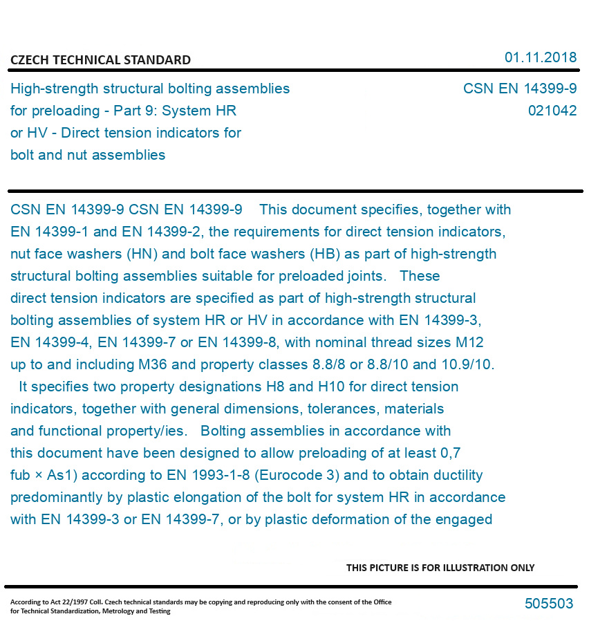 CSN EN 14399-9 This document specifies, together with EN 14399-1 and EN 14399-2, the requirements for direct tension indicators, nut face washers (HN) and bolt face washers (HB) as part of high-strength structural bolting assemblies suitable for preloaded joints. These direct tension indicators are specified as part of high-strength structural bolting assemblies of system HR or HV in accordance with EN 14399-3, EN 14399-4, EN 14399-7 or EN 14399-8, with nominal thread sizes M12 up to and including M36 and property classes 8.8/8 or 8.8/10 and 10.9/10. It specifies two property designations H8 and H10 for direct tension indicators, together with general dimensions, tolerances, materials and functional property/ies. Bolting assemblies in accordance with this document have been designed to allow preloading of at least 0,7 fub × As1) according to EN 1993-1-8 (Eurocode 3) and to obtain ductility predominantly by plastic elongation of the bolt for system HR in accordance with EN 14399-3 or EN 14399-7, or by plastic deformation of the engaged threads for system HV in accordance with EN 14399-4 or EN 14399-8. Bolting assemblies conforming to this document may include washer(s) according to EN 14399-6 or to EN 14399-5 (under the nut only). NOTE 1: Attention is drawn to the importance of ensuring that the bolting assemblies are correctly used if satisfactory results are to be obtained. For recommendations concerning proper application, reference to EN 1090-2 is made. General requirements and requirements for suitability for preloading are specified in EN 14399-2 together with Clause 5 of this document. NOTE 2: Direct tension indicators are also known as load indicating washers. 1) fub is the nominal tensile strength (Rm) and As is the nominal stress area of the bolt. Original English text of CSN EN Standard. The price of the Standard included all amendments and correcturs.