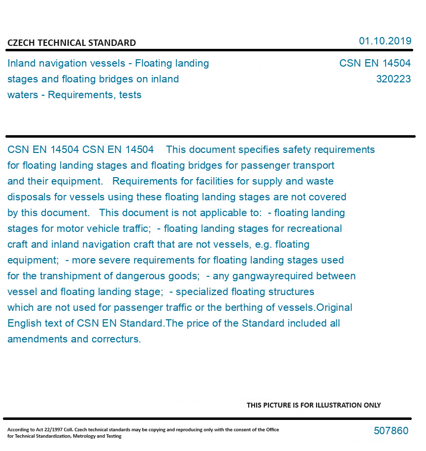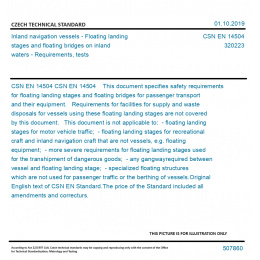 CSN EN 14504 This document specifies safety requirements for floating landing stages and floating bridges for passenger transport and their equipment. Requirements for facilities for supply and waste disposals for vessels using these floating landing stages are not covered by this document. This document is not applicable to: - floating landing stages for motor vehicle traffic; - floating landing stages for recreational craft and inland navigation craft that are not vessels, e.g. floating equipment; - more severe requirements for floating landing stages used for the transhipment of dangerous goods; - any gangwayrequired between vessel and floating landing stage; - specialized floating structures which are not used for passenger traffic or the berthing of vessels. Original English text of CSN EN Standard. The price of the Standard included all amendments and correcturs.