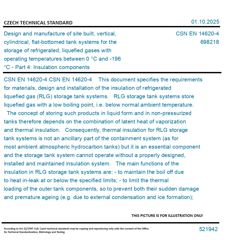 >CSN Standards>69 MACHINERY FOR CHEMICAL INDUSTRY>6982 Steel reservoirs>CSN EN 14620-4 - Design and manufacture of site built, vertical, cylindrical, flat-bottomed tank systems for the storage of refrigerated, liquefied gases with operating temperatures between 0 °C and -196 °C - Part 4: Insulation components