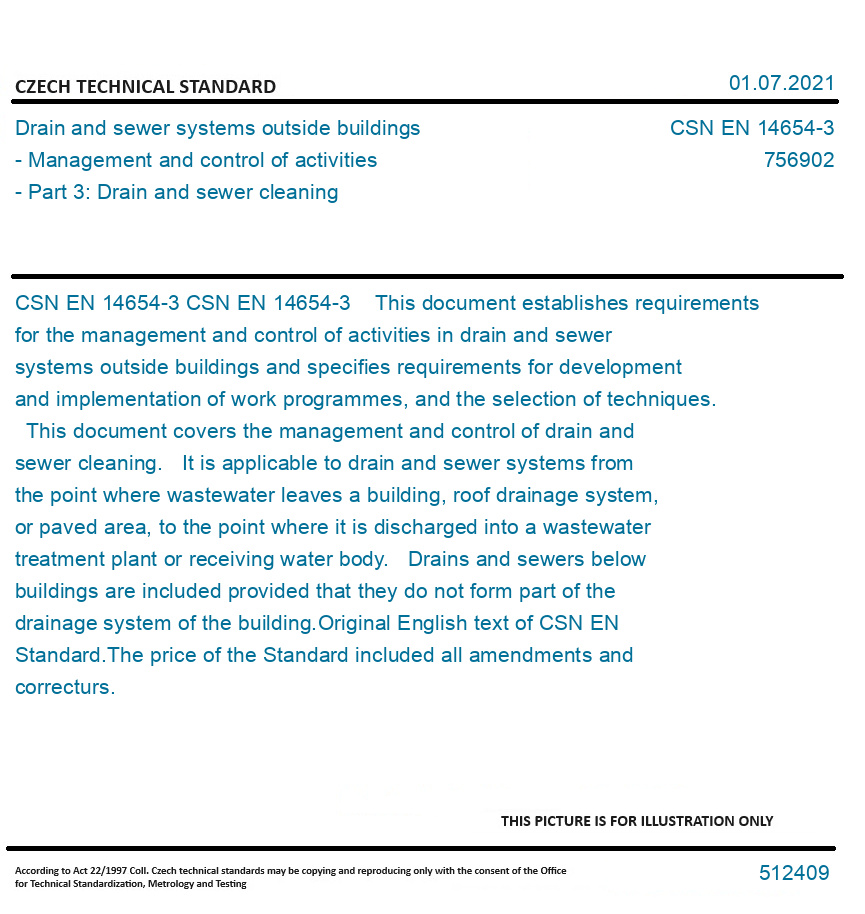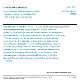 CSN EN 14654-3 This document establishes requirements for the management and control of activities in drain and sewer systems outside buildings and specifies requirements for development and implementation of work programmes, and the selection of techniques. This document covers the management and control of drain and sewer cleaning. It is applicable to drain and sewer systems from the point where wastewater leaves a building, roof drainage system, or paved area, to the point where it is discharged into a wastewater treatment plant or receiving water body. Drains and sewers below buildings are included provided that they do not form part of the drainage system of the building. Original English text of CSN EN Standard. The price of the Standard included all amendments and correcturs.