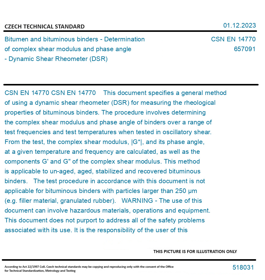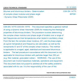 CSN EN 14770 This document specifies a general method of using a dynamic shear rheometer (DSR) for measuring the rheological properties of bituminous binders. The procedure involves determining the complex shear modulus and phase angle of binders over a range of test frequencies and test temperatures when tested in oscillatory shear. From the test, the complex shear modulus, |G*|, and its phase angle, at a given temperature and frequency are calculated, as well as the components G' and G" of the complex shear modulus. This method is applicable to un-aged, aged, stabilized and recovered bituminous binders. The test procedure in accordance with this document is not applicable for bituminous binders with particles larger than 250 µm (e.g. filler material, granulated rubber). WARNING - The use of this document can involve hazardous materials, operations and equipment. This document does not purport to address all of the safety problems associated with its use. It is the responsibility of the user of this document to establish appropriate safety and health practices and to determine the applicability of regulatory limitations prior to use. Original English text of CSN EN Standard. The price of the Standard included all amendments and correcturs.