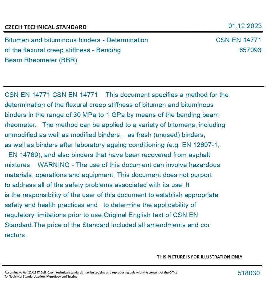 CSN EN 14771 This document specifies a method for the determination of the flexural creep stiffness of bitumen and bituminous binders in the range of 30 MPa to 1 GPa by means of the bending beam rheometer. The method can be applied to a variety of bitumens, including unmodified as well as modified binders, as fresh (unused) binders, as well as binders after laboratory ageing conditioning (e.g. EN 12607-1, EN 14769), and also binders that have been recovered from asphalt mixtures. WARNING - The use of this document can involve hazardous materials, operations and equipment. This document does not purport to address all of the safety problems associated with its use. It is the responsibility of the user of this document to establish appropriate safety and health practices and to determine the applicability of regulatory limitations prior to use. Original English text of CSN EN Standard. The price of the Standard included all amendments and correcturs.