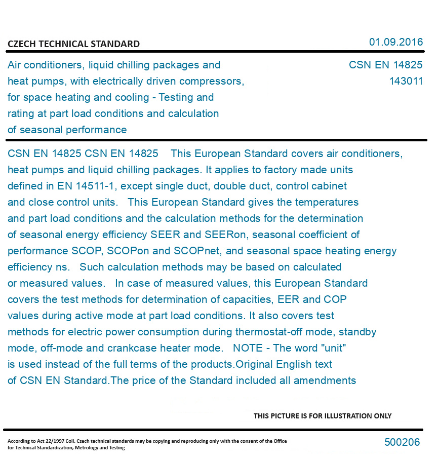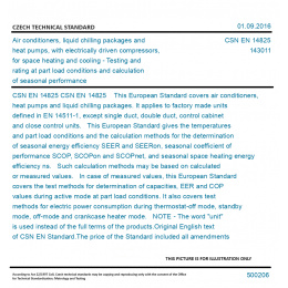 CSN EN 14825 This European Standard covers air conditioners, heat pumps and liquid chilling packages. It applies to factory made units defined in EN 14511-1, except single duct, double duct, control cabinet and close control units. This European Standard gives the temperatures and part load conditions and the calculation methods for the determination of seasonal energy efficiency SEER and SEERon, seasonal coefficient of performance SCOP, SCOPon and SCOPnet, and seasonal space heating energy efficiency ns. Such calculation methods may be based on calculated or measured values. In case of measured values, this European Standard covers the test methods for determination of capacities, EER and COP values during active mode at part load conditions. It also covers test methods for electric power consumption during thermostat-off mode, standby mode, off-mode and crankcase heater mode. NOTE - The word "unit" is used instead of the full terms of the products. Original English text of CSN EN Standard. The price of the Standard included all amendments and correcturs.