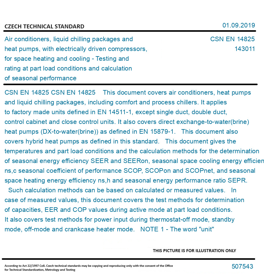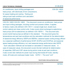 CSN EN 14825 This document covers air conditioners, heat pumps and liquid chilling packages, including comfort and process chillers. It applies to factory made units defined in EN 14511-1, except single duct, double duct, control cabinet and close control units. It also covers direct exchange-to-water(brine) heat pumps (DX-to-water(brine)) as defined in EN 15879-1. This document also covers hybrid heat pumps as defined in this standard. This document gives the temperatures and part load conditions and the calculation methods for the determination of seasonal energy efficiency SEER and SEERon, seasonal space cooling energy efficiency ns,c seasonal coefficient of performance SCOP, SCOPon and SCOPnet, and seasonal space heating energy efficiency ns,h and seasonal energy performance ratio SEPR. Such calculation methods can be based on calculated or measured values. In case of measured values, this document covers the test methods for determination of capacities, EER and COP values during active mode at part load conditions. It also covers test methods for power input during thermostat-off mode, standby mode, off-mode and crankcase heater mode. NOTE 1 - The word "unit" is used instead of the full terms of the products. NOTE 2 - The word "cooling" is used to refer to both space cooling and process cooling. NOTE 3 - The word "heating" is used to refer to space heating. Original English text of CSN EN Standard. The price of the Standard included all amendments and correcturs.