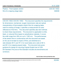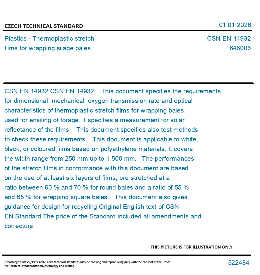CSN EN 14932 This document specifies the requirements for dimensional, mechanical, oxygen transmission rate and optical characteristics of thermoplastic stretch films for wrapping bales used for ensiling of forage. It specifies a measurement for solar reflectance of the films. This document specifies also test methods to check these requirements. This document is applicable to white, black, or coloured films based on polyethylene materials. It covers the width range from 250 mm up to 1 500 mm. The performances of the stretch films in conformance with this document are based on the use of at least six layers of films, pre-stretched at a ratio between 60 % and 70 % for round bales and a ratio of 55 % and 65 % for wrapping square bales. This document also gives guidance for design for recycling.