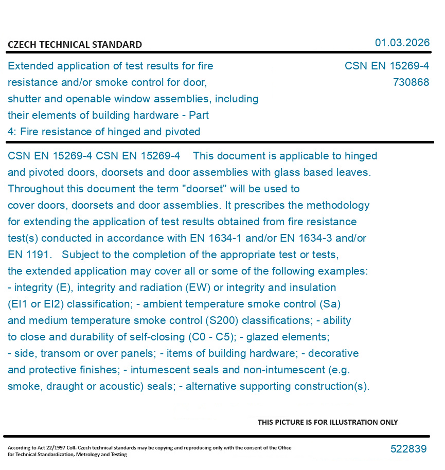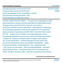 CSN EN 15269-4 This document is applicable to hinged and pivoted doors, doorsets and door assemblies with glass based leaves. Throughout this document the term "doorset" will be used to cover doors, doorsets and door assemblies. It prescribes the methodology for extending the application of test results obtained from fire resistance test(s) conducted in accordance with EN 1634-1 and/or EN 1634-3 and/or EN 1191. Subject to the completion of the appropriate test or tests, the extended application may cover all or some of the following examples: - integrity (E), integrity and radiation (EW) or integrity and insulation (EI1 or EI2) classification; - ambient temperature smoke control (Sa) and medium temperature smoke control (S200) classifications; - ability to close and durability of self-closing (C0 - C5); - glazed elements; - side, transom or over panels; - items of building hardware; - decorative and protective finishes; - intumescent seals and non-intumescent (e.g. smoke, draught or acoustic) seals; - alternative supporting construction(s). This document does not apply to horizontal doorsets and windows.