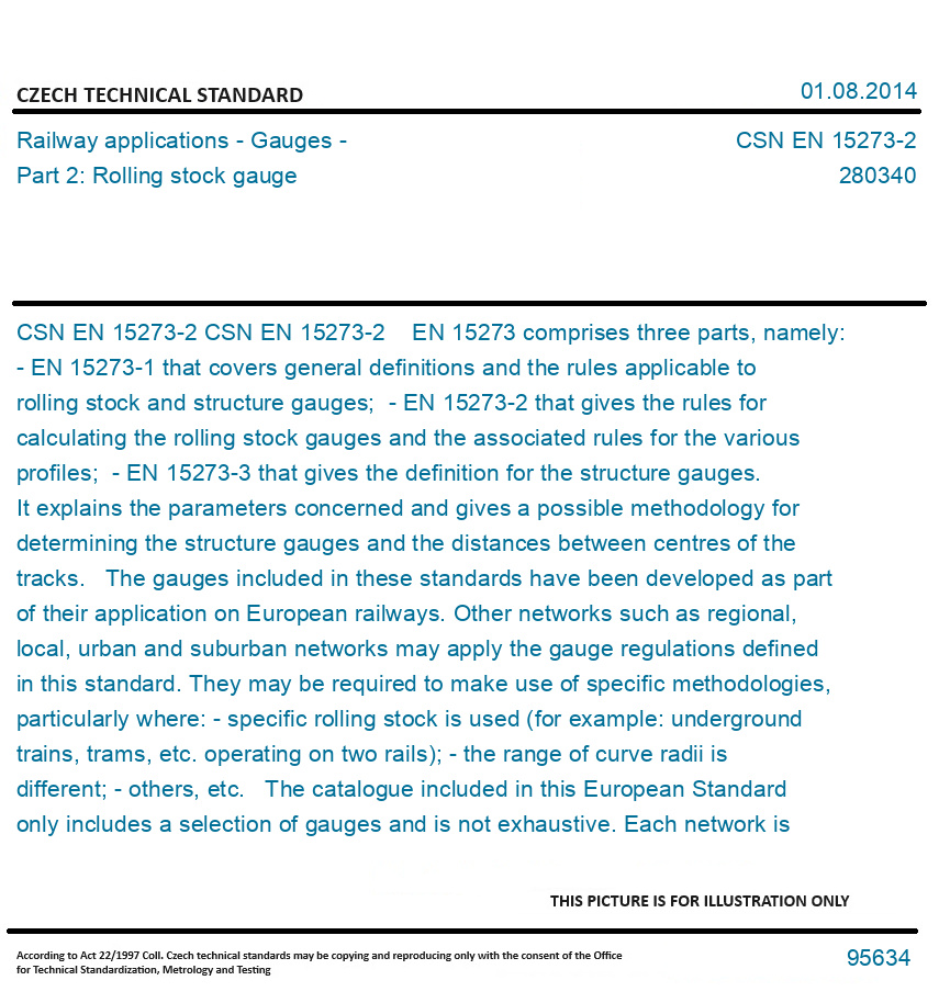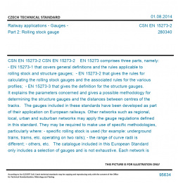 CSN EN 15273-2 EN 15273 comprises three parts, namely: - EN 15273-1 that covers general definitions and the rules applicable to rolling stock and structure gauges; - EN 15273-2 that gives the rules for calculating the rolling stock gauges and the associated rules for the various profiles; - EN 15273-3 that gives the definition for the structure gauges. It explains the parameters concerned and gives a possible methodology for determining the structure gauges and the distances between centres of the tracks. The gauges included in these standards have been developed as part of their application on European railways. Other networks such as regional, local, urban and suburban networks may apply the gauge regulations defined in this standard. They may be required to make use of specific methodologies, particularly where: - specific rolling stock is used (for example: underground trains, trams, etc. operating on two rails); - the range of curve radii is different; - others, etc. The catalogue included in this European Standard only includes a selection of gauges and is not exhaustive. Each network is free to define the gauges in accordance with their own needs. Original English text of CSN EN Standard. The price of the Standard included all amendments and correcturs.