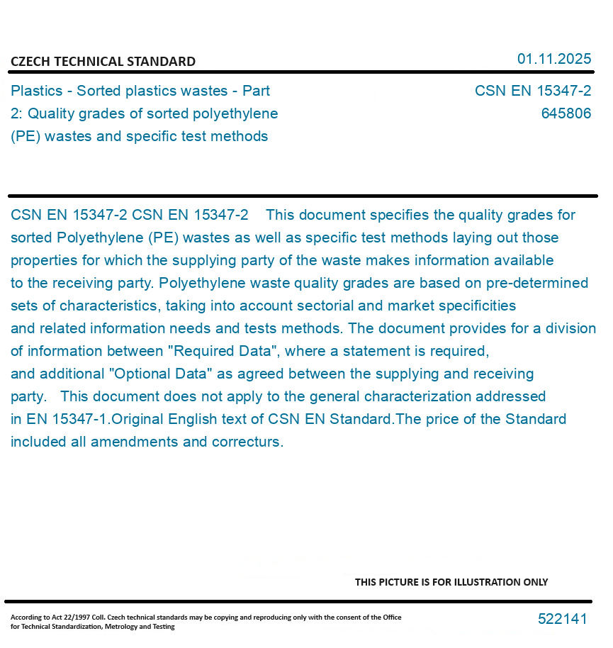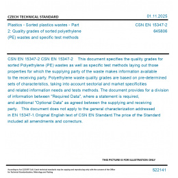 CSN EN 15347-2 This document specifies the quality grades for sorted Polyethylene (PE) wastes as well as specific test methods laying out those properties for which the supplying party of the waste makes information available to the receiving party. Polyethylene waste quality grades are based on pre-determined sets of characteristics, taking into account sectorial and market specificities and related information needs and tests methods. The document provides for a division of information between "Required Data", where a statement is required, and additional "Optional Data" as agreed between the supplying and receiving party. This document does not apply to the general characterization addressed in EN 15347-1. Original English text of CSN EN Standard. The price of the Standard included all amendments and correcturs.