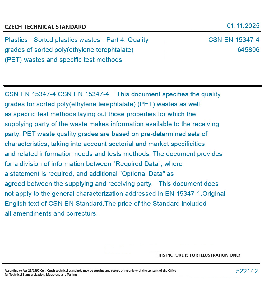 >CSN Standards>64 PLASTICS>6458 Recycled plastics>CSN EN 15347-4 - Plastics - Sorted plastics wastes - Part 4: Quality grades of sorted poly(ethylene terephtalate) (PET) wastes and specific test methods