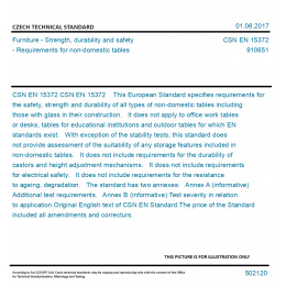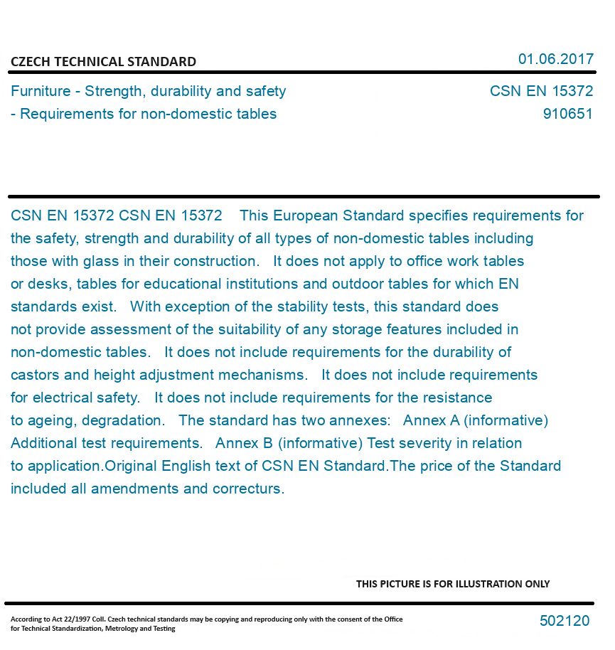 CSN EN 15372 This European Standard specifies requirements for the safety, strength and durability of all types of non-domestic tables including those with glass in their construction. It does not apply to office work tables or desks, tables for educational institutions and outdoor tables for which EN standards exist. With exception of the stability tests, this standard does not provide assessment of the suitability of any storage features included in non-domestic tables. It does not include requirements for the durability of castors and height adjustment mechanisms. It does not include requirements for electrical safety. It does not include requirements for the resistance to ageing, degradation. The standard has two annexes: Annex A (informative) Additional test requirements. Annex B (informative) Test severity in relation to application. Original English text of CSN EN Standard. The price of the Standard included all amendments and correcturs.