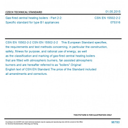 CSN EN 15502-2-2 This European Standard specifies, the requirements and test methods concerning, in particular the construction, safety, fitness for purpose, and rational use of energy, as well as the classification and marking of gas-fired central heating boilers that are fitted with atmospheric burners, fan assisted atmospheric burners and are hereafter referred to as "boilers". Original English text of CSN EN Standard. The price of the Standard included all amendments and correcturs.