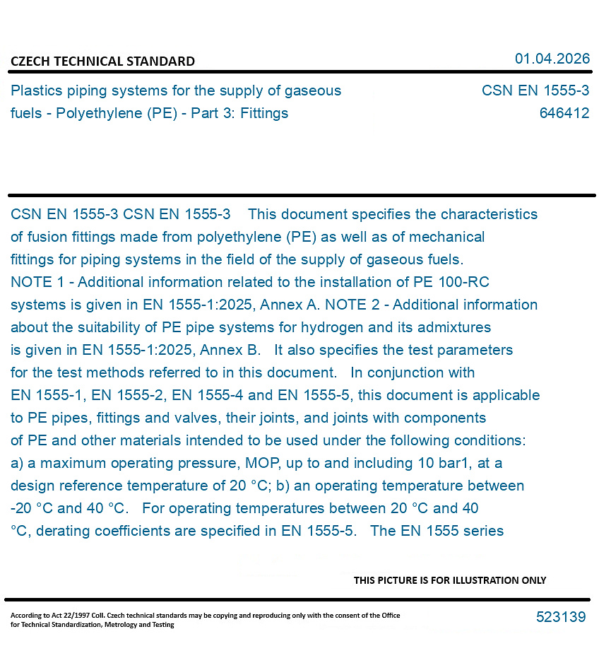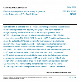 CSN EN 1555-3 This document specifies the characteristics of fusion fittings made from polyethylene (PE) as well as of mechanical fittings for piping systems in the field of the supply of gaseous fuels. NOTE 1 - Additional information related to the installation of PE 100-RC systems is given in EN 1555-1:2025, Annex A. NOTE 2 - Additional information about the suitability of PE pipe systems for hydrogen and its admixtures is given in EN 1555-1:2025, Annex B. It also specifies the test parameters for the test methods referred to in this document. In conjunction with EN 1555-1, EN 1555-2, EN 1555-4 and EN 1555-5, this document is applicable to PE pipes, fittings and valves, their joints, and joints with components of PE and other materials intended to be used under the following conditions: a) a maximum operating pressure, MOP, up to and including 10 bar1, at a design reference temperature of 20 °C; b) an operating temperature between -20 °C and 40 °C. For operating temperatures between 20 °C and 40 °C, derating coefficients are specified in EN 1555-5. The EN 1555 series covers a range of MOPs and gives requirements concerning colours. This document is applicable for fittings of the following types: a) electrofusion socket fittings; b) electrofusion saddle fittings; c) spigot end fittings (for butt fusion using heated tools and electrofusion); d) mechanical fittings. It is the responsibility of the purchaser or specifier to make the appropriate selections from these aspects, taking into account their particular requirements and any relevant national guidance or regulations and installation practices or codes. NOTE 3 - The fittings can be, for example, in the form of couplers, saddles, equal and reduced tees, reducers, elbows, bends or end caps.