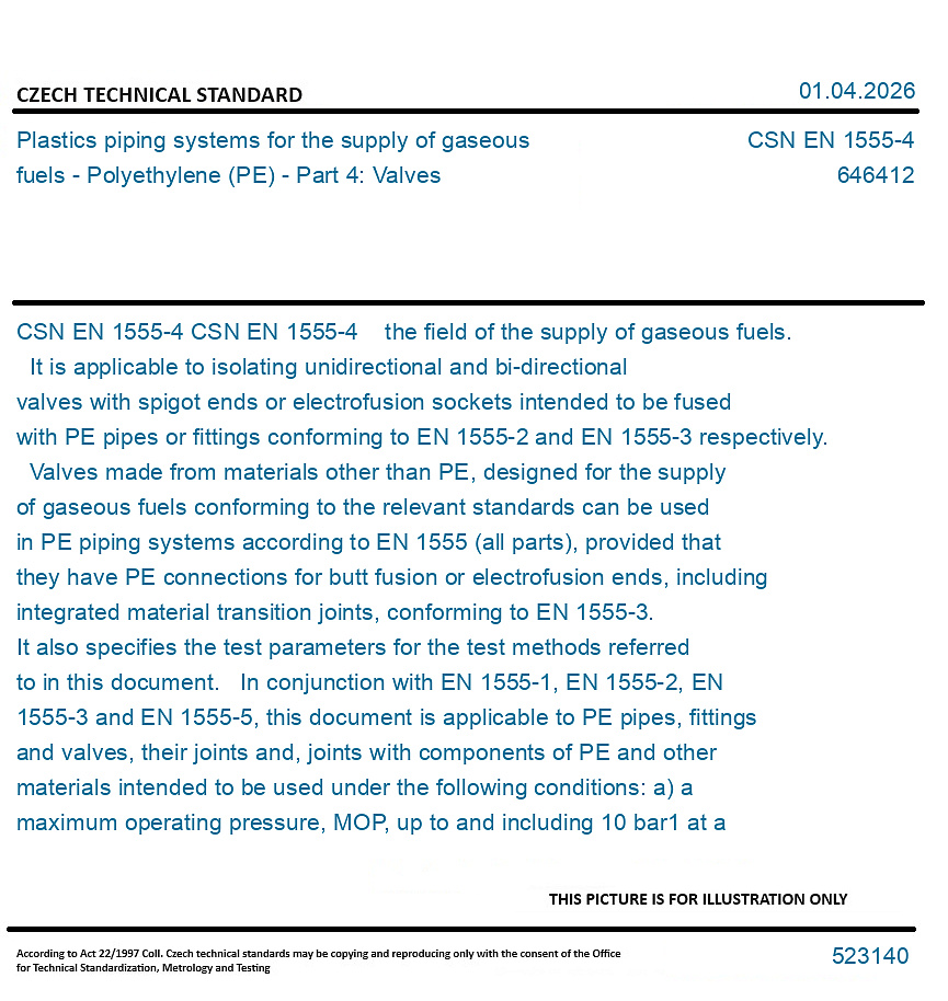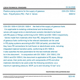 CSN EN 1555-4 the field of the supply of gaseous fuels. It is applicable to isolating unidirectional and bi-directional valves with spigot ends or electrofusion sockets intended to be fused with PE pipes or fittings conforming to EN 1555-2 and EN 1555-3 respectively. Valves made from materials other than PE, designed for the supply of gaseous fuels conforming to the relevant standards can be used in PE piping systems according to EN 1555 (all parts), provided that they have PE connections for butt fusion or electrofusion ends, including integrated material transition joints, conforming to EN 1555-3. It also specifies the test parameters for the test methods referred to in this document. In conjunction with EN 1555-1, EN 1555-2, EN 1555-3 and EN 1555-5, this document is applicable to PE pipes, fittings and valves, their joints and, joints with components of PE and other materials intended to be used under the following conditions: a) a maximum operating pressure, MOP, up to and including 10 bar1 at a design reference temperature of 20 °C; NOTE 1 - For the purpose of this document and the references to ISO 8233, MOP is considered to be nominal pressure. b) an operating temperature between -20 °C to 40 °C. For operating temperatures between 20 °C and 40 °C, derating coefficients are specified in EN 1555-5. The EN 1555 series covers a range of MOPs and gives requirements concerning colours. It is the responsibility of the purchaser or specifier to make the appropriate selections from these aspects, taking into account their particular requirements and any relevant national regulations and installation practices or codes. This document covers valve bodies designed for connection with pipes with a nominal outside diameter dn <= 400 mm. NOTE 2 - Additional information related to the installation of PE 100-RC systems is given in EN 1555-1:2025, Annex A. NOTE 3 - Additional information about the suitability of PE pipe systems for hydrogen and its admixtures is given in EN 1555-1:2025, Annex B.