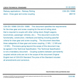 CSN EN 15566 This document specifies the requirements for the draw gear and screw coupling for the end of rolling stock that is required to couple with other rolling stock (freight wagons, locomotives, passenger vehicles, etc.). This document covers the functionality, construction, interfaces and testing including pass/fail criteria for draw gear and screw coupling. The document describes three categories of draw gear and screw coupling, (1 MN, 1,2 MN and 1,5 MN). Provisions going beyond the scope of this document may be agreed in the Technical Specification. The Technical Specification is not a mandatory document. Coupling systems between permanently coupled vehicle units are not in the scope of this document. Original English text of CSN EN Standard. The price of the Standard included all amendments and correcturs.