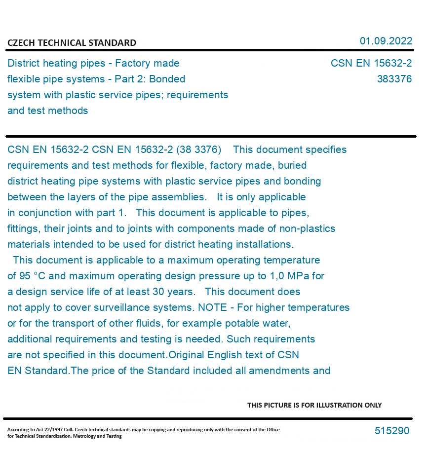 CSN EN 15632-2 (38 3376) This document specifies requirements and test methods for flexible, factory made, buried district heating pipe systems with plastic service pipes and bonding between the layers of the pipe assemblies. It is only applicable in conjunction with part 1. This document is applicable to pipes, fittings, their joints and to joints with components made of non-plastics materials intended to be used for district heating installations. This document is applicable to a maximum operating temperature of 95 °C and maximum operating design pressure up to 1,0 MPa for a design service life of at least 30 years. This document does not apply to cover surveillance systems. NOTE - For higher temperatures or for the transport of other fluids, for example potable water, additional requirements and testing is needed. Such requirements are not specified in this document. Original English text of CSN EN Standard. The price of the Standard included all amendments and correcturs.