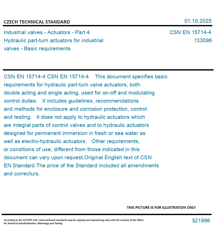 CSN EN 15714-4 This document specifies basic requirements for hydraulic part-turn valve actuators, both double acting and single acting, used for on-off and modulating control duties. It includes guidelines, recommendations and methods for enclosure and corrosion protection, control and testing. It does not apply to hydraulic actuators which are integral parts of control valves and to hydraulic actuators designed for permanent immersion in fresh or sea water as well as electro-hydraulic actuators. Other requirements, or conditions of use, different from those indicated in this document can vary upon request. Original English text of CSN EN Standard. The price of the Standard included all amendments and correcturs.