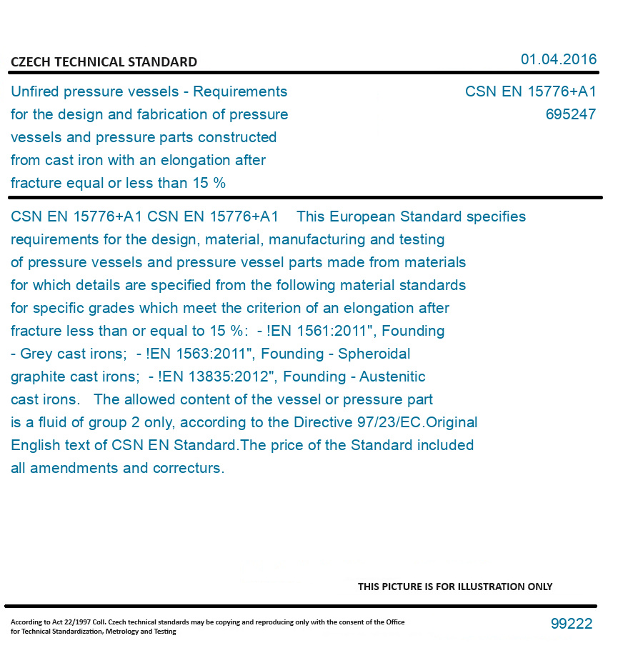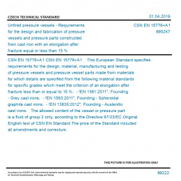 CSN EN 15776+A1 This European Standard specifies requirements for the design, material, manufacturing and testing of pressure vessels and pressure vessel parts made from materials for which details are specified from the following material standards for specific grades which meet the criterion of an elongation after fracture less than or equal to 15 %: - !EN 1561:2011", Founding - Grey cast irons; - !EN 1563:2011", Founding - Spheroidal graphite cast irons; - !EN 13835:2012", Founding - Austenitic cast irons. The allowed content of the vessel or pressure part is a fluid of group 2 only, according to the Directive 97/23/EC. Original English text of CSN EN Standard. The price of the Standard included all amendments and correcturs.