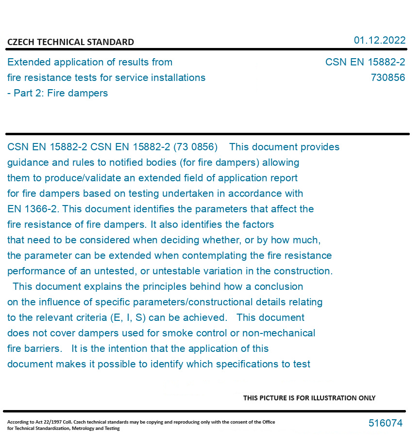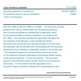 CSN EN 15882-2 (73 0856) This document provides guidance and rules to notified bodies (for fire dampers) allowing them to produce/validate an extended field of application report for fire dampers based on testing undertaken in accordance with EN 1366-2. This document identifies the parameters that affect the fire resistance of fire dampers. It also identifies the factors that need to be considered when deciding whether, or by how much, the parameter can be extended when contemplating the fire resistance performance of an untested, or untestable variation in the construction. This document explains the principles behind how a conclusion on the influence of specific parameters/constructional details relating to the relevant criteria (E, I, S) can be achieved. This document does not cover dampers used for smoke control or non-mechanical fire barriers. It is the intention that the application of this document makes it possible to identify which specifications to test to maximize the field of application. Some information on test programmes is given for guidance purposes. Original English text of CSN EN Standard. The price of the Standard included all amendments and correcturs.
