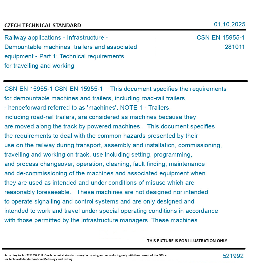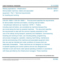 CSN EN 15955-1 This document specifies the requirements for demountable machines and trailers, including road-rail trailers - henceforward referred to as 'machines'. NOTE 1 - Trailers, including road-rail trailers, are considered as machines because they are moved along the track by powered machines. This document specifies the requirements to deal with the common hazards presented by their use on the railway during transport, assembly and installation, commissioning, travelling and working on track, use including setting, programming, and process changeover, operation, cleaning, fault finding, maintenance and de-commissioning of the machines and associated equipment when they are used as intended and under conditions of misuse which are reasonably foreseeable. These machines are not designed nor intended to operate signalling and control systems and are only designed and intended to work and travel under special operating conditions in accordance with those permitted by the infrastructure managers. These machines are not permitted to run on railway lines open to normal traffic. NOTE 2 - Other rail mounted railway maintenance and infrastructure inspection machines are dealt with in other European standards, see Technical Report CEN/TR 17498:2020. This document is also applicable to machines and associated equipment that in working mode are partly supported on the ballast or the formation. The requirements in this document are based on the assumption that the machines are used, operated and maintained by skilled person(s). This document does not include the requirements for: - quality of the work or performance of the machine; - use of separate equipment temporarily mounted on machines; - machines that utilize the overhead contact line system for traction purposes or as a power source; - hazards due to air pressure caused by the passing of high-speed trains at more than 200 km/h; - operation subject to special rules, e.g. potentially explosive atmospheres; - hazards due to natural causes, e.g. earthquake, lightning, flooding; - working methods; - operation in severe working conditions requiring special measures, e.g. corrosive environments, contaminating environments, strong magnetic fields; - hazards occurring when used to handle suspended loads which may swing freely. Original English text of CSN EN Standard. The price of the Standard included all amendments and correcturs.