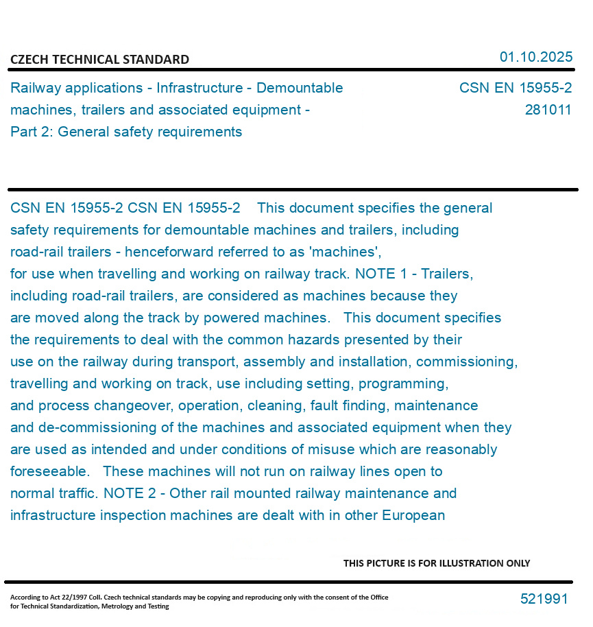 CSN EN 15955-2 This document specifies the general safety requirements for demountable machines and trailers, including road-rail trailers - henceforward referred to as 'machines', for use when travelling and working on railway track. NOTE 1 - Trailers, including road-rail trailers, are considered as machines because they are moved along the track by powered machines. This document specifies the requirements to deal with the common hazards presented by their use on the railway during transport, assembly and installation, commissioning, travelling and working on track, use including setting, programming, and process changeover, operation, cleaning, fault finding, maintenance and de-commissioning of the machines and associated equipment when they are used as intended and under conditions of misuse which are reasonably foreseeable. These machines will not run on railway lines open to normal traffic. NOTE 2 - Other rail mounted railway maintenance and infrastructure inspection machines are dealt with in other European standards, see Technical Report CEN/TR 17498:2020. This document is also applicable to machines and associated equipment that in working mode are partly supported on the ballast or the formation. The requirements in this document are based on the assumption that the machines are used, operated and maintained by skilled person(s). This document does not include requirements for: - quality of the work or performance of the machine; - use of separate equipment temporarily mounted on machines; - machines that utilize external power supplies such as the overhead contact line system for traction purposes or as a power source; - hazards due to air pressure caused by the passing of high-speed trains at more than 200 km/h; - operation subject to special rules, e.g. potentially explosive atmospheres; - hazards due to natural causes, e.g. earthquake, lightning, flooding; - working methods; - operation in severe working conditions requiring special measures, e.g. corrosive environments, contaminating environments, strong magnetic fields; - hazards occurring when used to handle suspended loads which may swing freely. Original English text of CSN EN Standard. The price of the Standard included all amendments and correcturs.