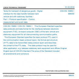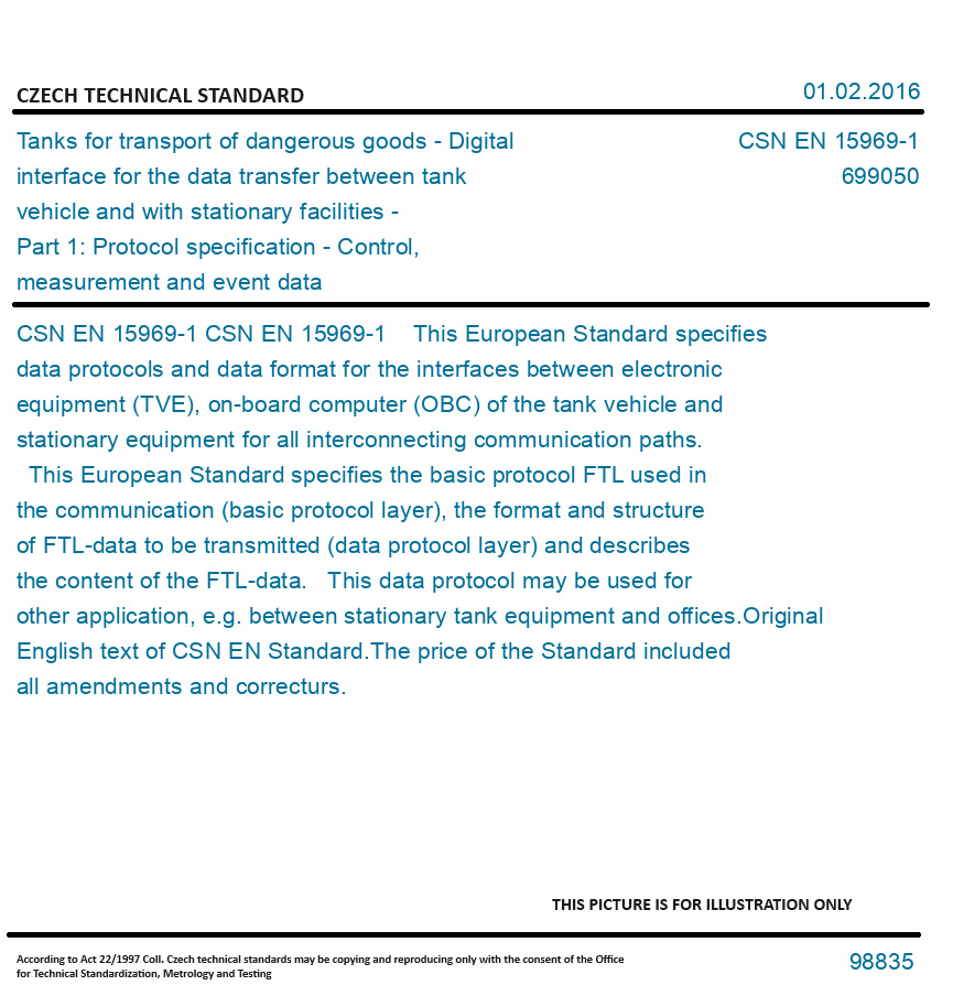 CSN EN 15969-1 This European Standard specifies data protocols and data format for the interfaces between electronic equipment (TVE), on-board computer (OBC) of the tank vehicle and stationary equipment for all interconnecting communication paths. This European Standard specifies the basic protocol FTL used in the communication (basic protocol layer), the format and structure of FTL-data to be transmitted (data protocol layer) and describes the content of the FTL-data. This data protocol may be used for other application, e.g. between stationary tank equipment and offices. Original English text of CSN EN Standard. The price of the Standard included all amendments and correcturs.
