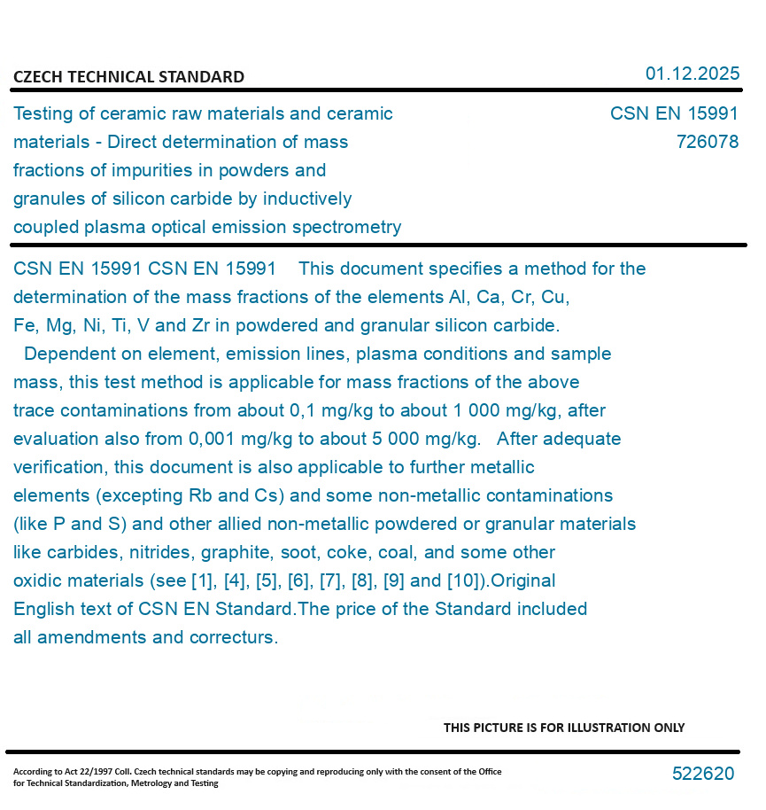 CSN EN 15991 This document specifies a method for the determination of the mass fractions of the elements Al, Ca, Cr, Cu, Fe, Mg, Ni, Ti, V and Zr in powdered and granular silicon carbide. Dependent on element, emission lines, plasma conditions and sample mass, this test method is applicable for mass fractions of the above trace contaminations from about 0,1 mg/kg to about 1 000 mg/kg, after evaluation also from 0,001 mg/kg to about 5 000 mg/kg. After adequate verification, this document is also applicable to further metallic elements (excepting Rb and Cs) and some non-metallic contaminations (like P and S) and other allied non-metallic powdered or granular materials like carbides, nitrides, graphite, soot, coke, coal, and some other oxidic materials (see [1], [4], [5], [6], [7], [8], [9] and [10]). Original English text of CSN EN Standard. The price of the Standard included all amendments and correcturs.