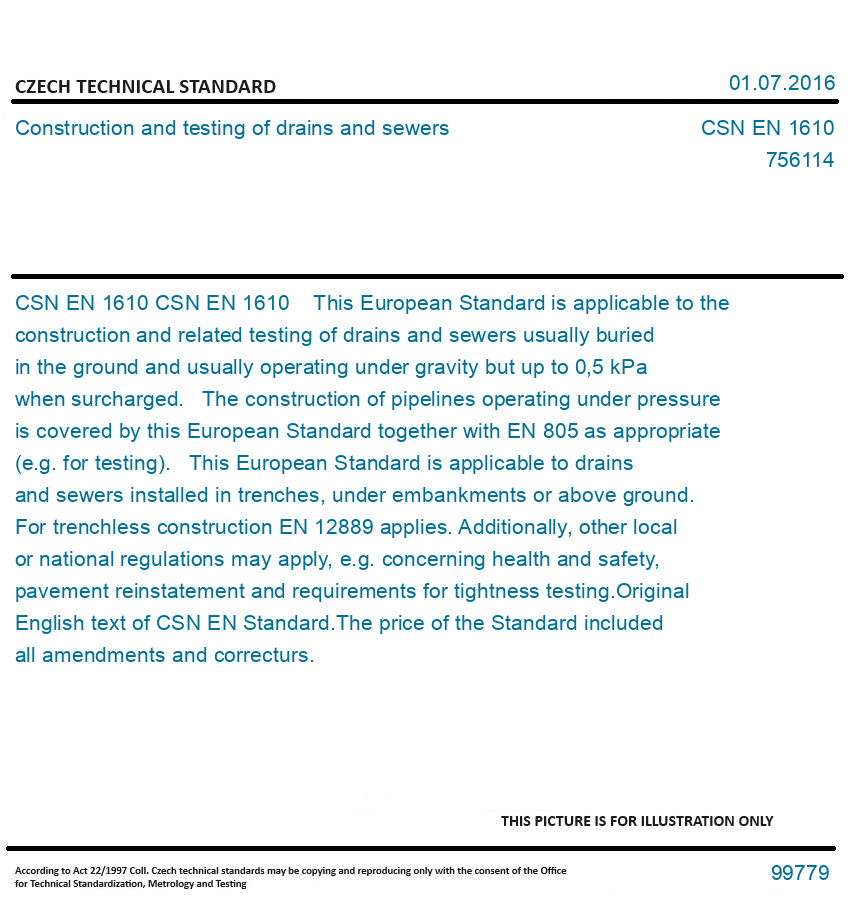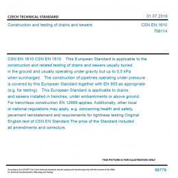 CSN EN 1610 This European Standard is applicable to the construction and related testing of drains and sewers usually buried in the ground and usually operating under gravity but up to 0,5 kPa when surcharged. The construction of pipelines operating under pressure is covered by this European Standard together with EN 805 as appropriate (e.g. for testing). This European Standard is applicable to drains and sewers installed in trenches, under embankments or above ground. For trenchless construction EN 12889 applies. Additionally, other local or national regulations may apply, e.g. concerning health and safety, pavement reinstatement and requirements for tightness testing. Original English text of CSN EN Standard. The price of the Standard included all amendments and correcturs.