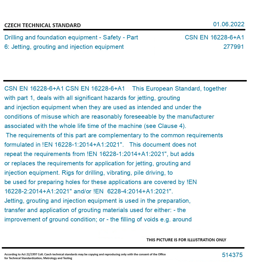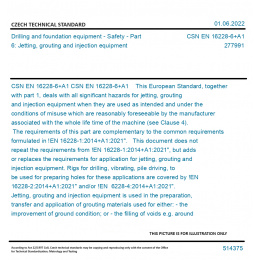 CSN EN 16228-6+A1 This European Standard, together with part 1, deals with all significant hazards for jetting, grouting and injection equipment when they are used as intended and under the conditions of misuse which are reasonably foreseeable by the manufacturer associated with the whole life time of the machine (see Clause 4). The requirements of this part are complementary to the common requirements formulated in !EN 16228-1:2014+A1:2021". This document does not repeat the requirements from !EN 16228-1:2014+A1:2021", but adds or replaces the requirements for application for jetting, grouting and injection equipment. Rigs for drilling, vibrating, pile driving, to be used for preparing holes for these applications are covered by !EN 16228-2:2014+A1:2021" and/or !EN 6228-4:2014+A1:2021". Jetting, grouting and injection equipment is used in the preparation, transfer and application of grouting materials used for either: - the improvement of ground condition; or - the filling of voids e.g. around piles or ground anchors. Jetting, grouting and injection equipment are constituted by all equipment and installations, operated by hand or electrically, pneumatically, mechanically or hydraulically powered, necessary for the following: - mixing, storing, measuring and pumping of substances (cement suspension, mortar or chemical liquids/mixtures); - jetting, grouting and injection processes (of/into subsoil) with low, medium or high pressure or vacuum systems; - !deleted text" - all control systems, electrical or mechanical pressure and flow recorders, for monitoring the grouting; - all jetting, grouting and injection accessories, such as: special tools, lances, rods, sockets, packers, retention clamps and swivel hooks. !This document does not apply to machines and equipment for conveying, spraying and placing concrete and mortar (covered by EN 12001). This document does not deal with jetting, grouting or injection units intended to use products that generate toxic gases.