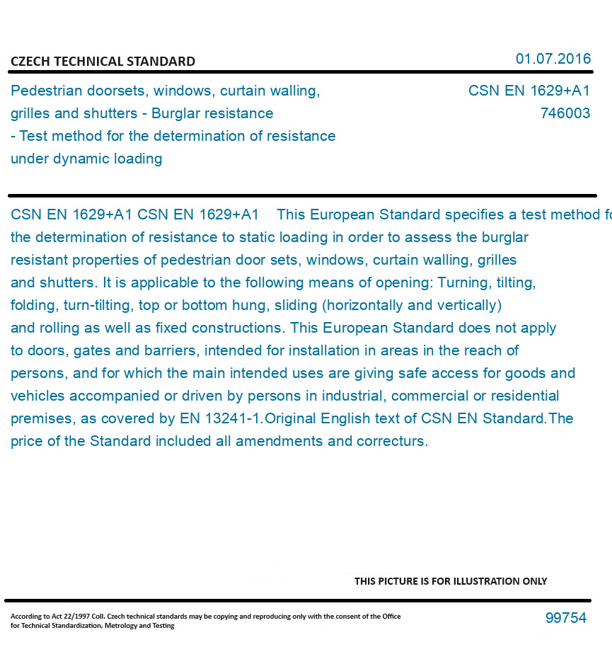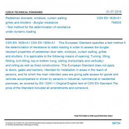 CSN EN 1629+A1 This European Standard specifies a test method for the determination of resistance to static loading in order to assess the burglar resistant properties of pedestrian door sets, windows, curtain walling, grilles and shutters. It is applicable to the following means of opening: Turning, tilting, folding, turn-tilting, top or bottom hung, sliding (horizontally and vertically) and rolling as well as fixed constructions. This European Standard does not apply to doors, gates and barriers, intended for installation in areas in the reach of persons, and for which the main intended uses are giving safe access for goods and vehicles accompanied or driven by persons in industrial, commercial or residential premises, as covered by EN 13241-1. Original English text of CSN EN Standard. The price of the Standard included all amendments and correcturs.